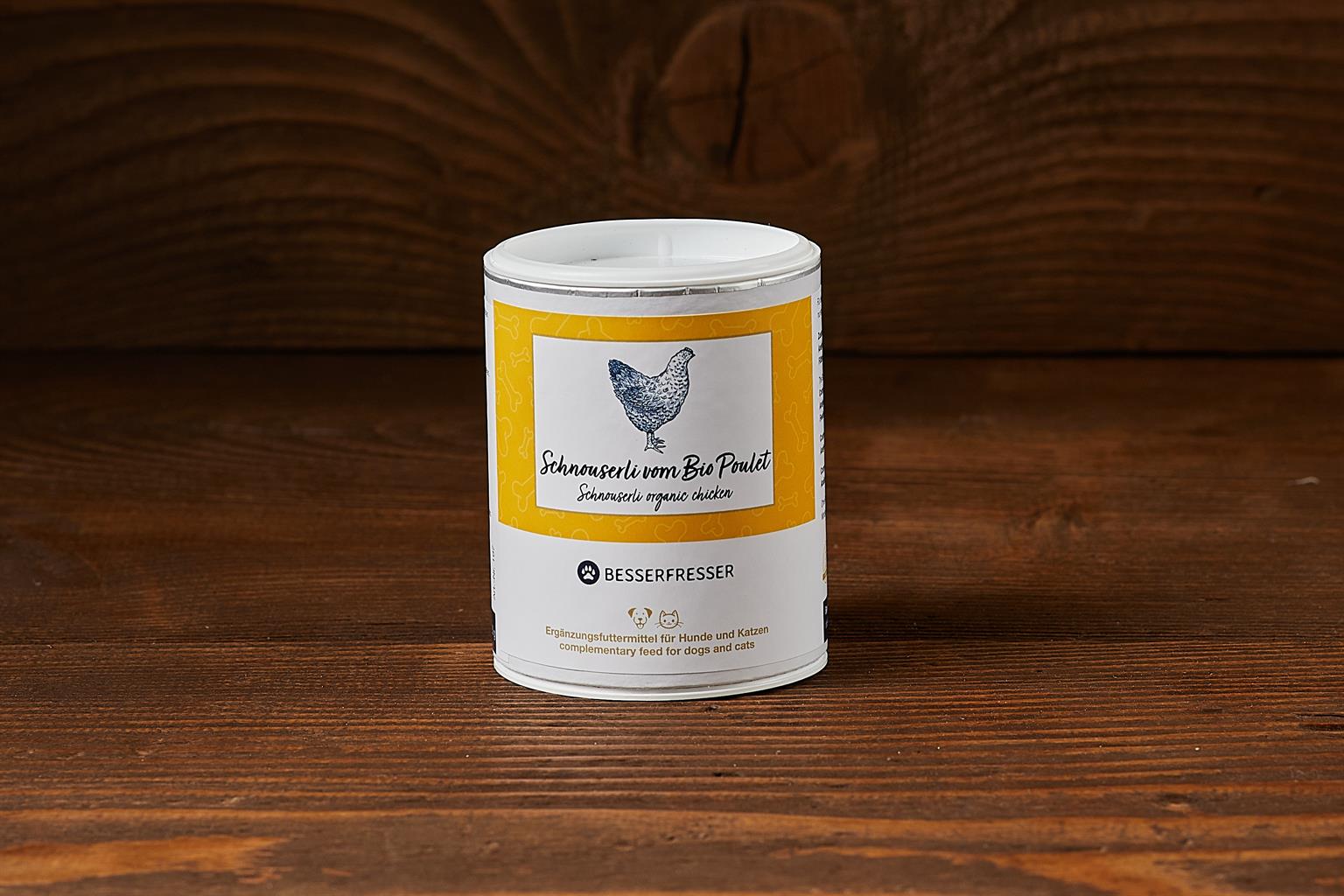 Bio Pouletfleisch 88.4%, Bio Pouletleber 6.6%, Bio Chiasamen 5%