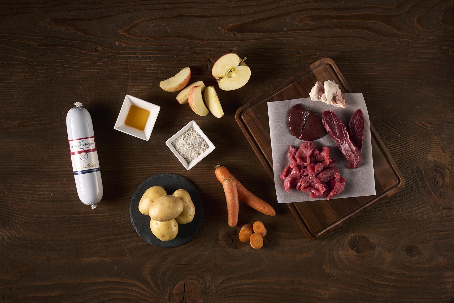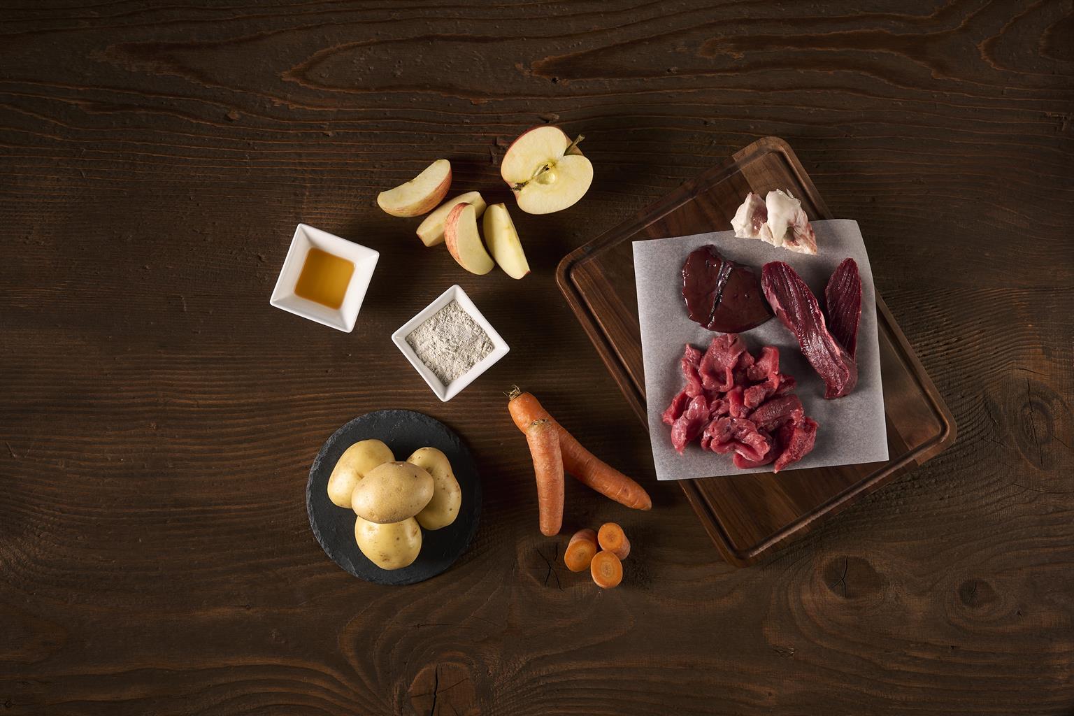 CH Rindermuskelfleisch 71%, Bio Karotten, 18.4%, Trinkwasser 5%, Bio Kartoffeln 4%, Algenkalk 0.5%, Bio Topinambur, Bio Flohsamenschalen, Bio Hagebutte, Berberin, Propolis