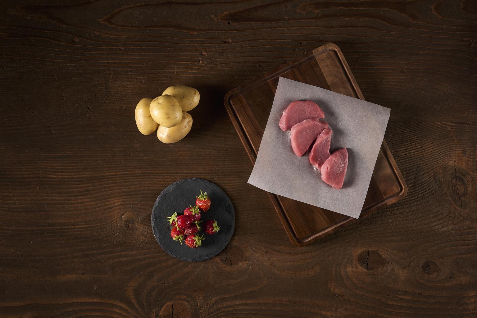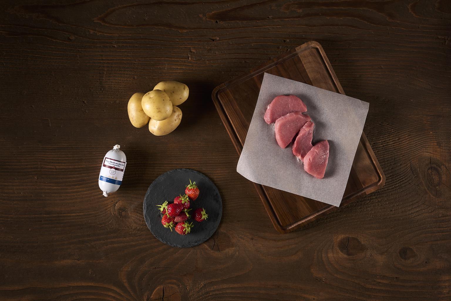 CH Rindermuskelfleisch 70%, Bio Kartoffeln 19%, Trinkwasser 10%, Bio Erdbeeren 1%